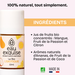 Lorsque l'on compare l'eau exquise L'Exotique - La Bio aux autres eaux aromatisées, la différence est limpide. Eau exquise propose des ingrédients 100% naturels, sans additifs artificiels, produits chimiques ou sucres.