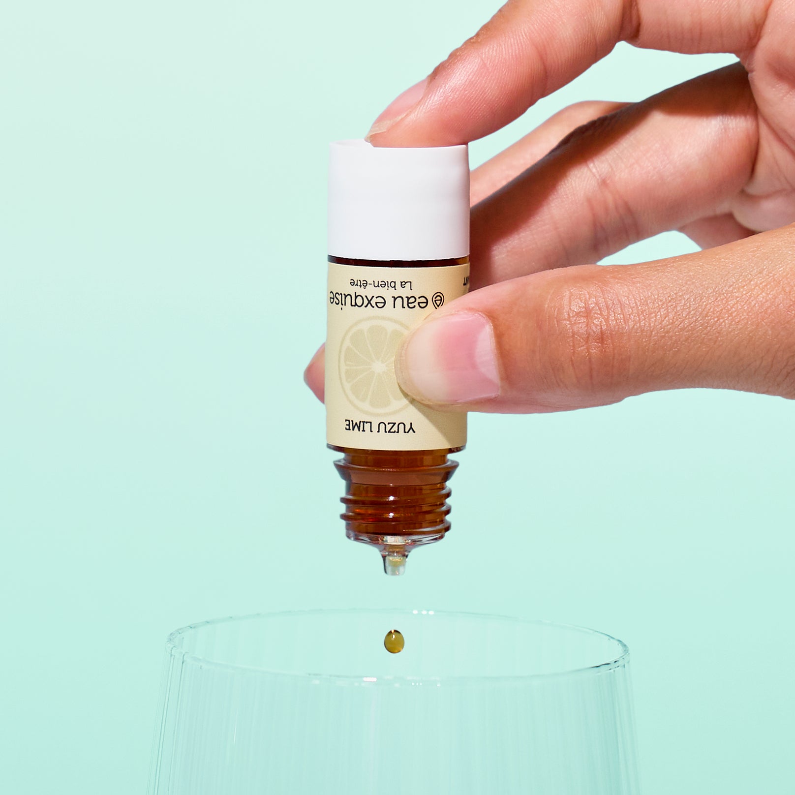 eau exquise se présente sous forme de gouttes ultraconcentrées, d'extraits de fruits, conditionnées dans une mini fiole recyclable.